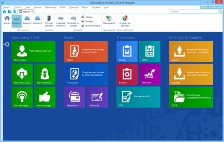 Ciel Compta a été conçu pour permettre aux PME-PMI (artisans, commerçants, etc.) de prendre en charge facilement et efficacement la comptabilité exhaustive de leur entreprise dans la limite de 5 dossiers. Ce logiciel vous assistera dès la saisie débit/crédit, jusqu’à la clôture de l’exercice, en passant par le lettrage et les rapprochements bancaires. L’application met à votre disposition tous les outils indispensables à la gestion de vos comptes : plan comptable, tableaux de bord, journaux, déclaration de TVA, modèles d’écritures comptable, etc. Dans cette édition 2014, vous disposez d’un assistant facilitant la mise à jour automatique des taux de TVA en vigueur, ainsi qu’un intuiciel à votre image. Vous avez ainsi la possibilité de personnaliser votre écran d’accueil avec les vignettes des fonctionnalités les plus utilisées. L’interface intuitive et fluide est désormais compatible avec les tablettes et PC tactiles Windows 8.