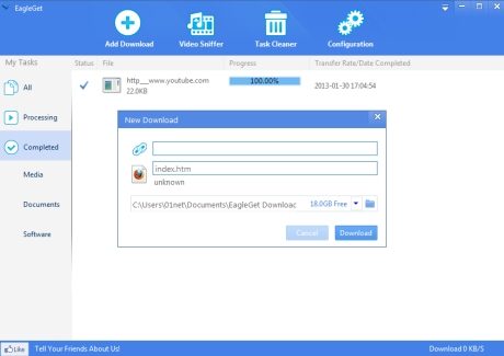 EagleGet est un utilitaire de téléchargement sobre, élégant et pratique. Il s’intègre à votre navigateur (Chrome, FF ou IE) et permet de télécharger tous types de fichiers ainsi que des vidéos issus de sites de vidéo en streaming tels que YouTube. EagleGetsupporte de nombreux protocoles et autorise le téléchargement de plusieurs fichiers simultanément. Il comporte également un gestionnaire qui organise les éléments téléchargés (logiciel, document ou média) et facilite leur suppression directement.