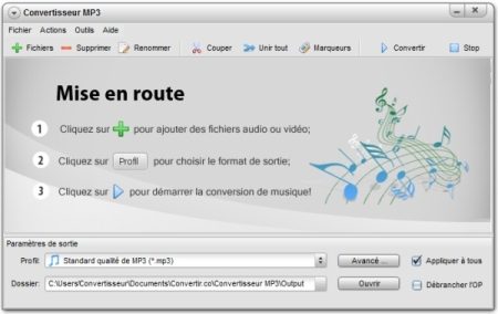 Convertissez toute votre musique au format MP3 grâce à Convertisseur MP3. Facile d’utilisation il suffit simplement de sélectionner le fichier à convertir, de choisir le format désiré (AC, MPA, WAV, WMA, OGG etc.) et de lancer la conversion. Avec Convertisseur MP3 vous avez la possibilité de couper la piste en donnant la position initiale et finale mais également d’unir les pistes transformées en un fichier audio ininterrompu. Simple et muni d’une interface intuitive, Convertisseur MP3 s’utilise gratuitement et sans aucune limitation.
