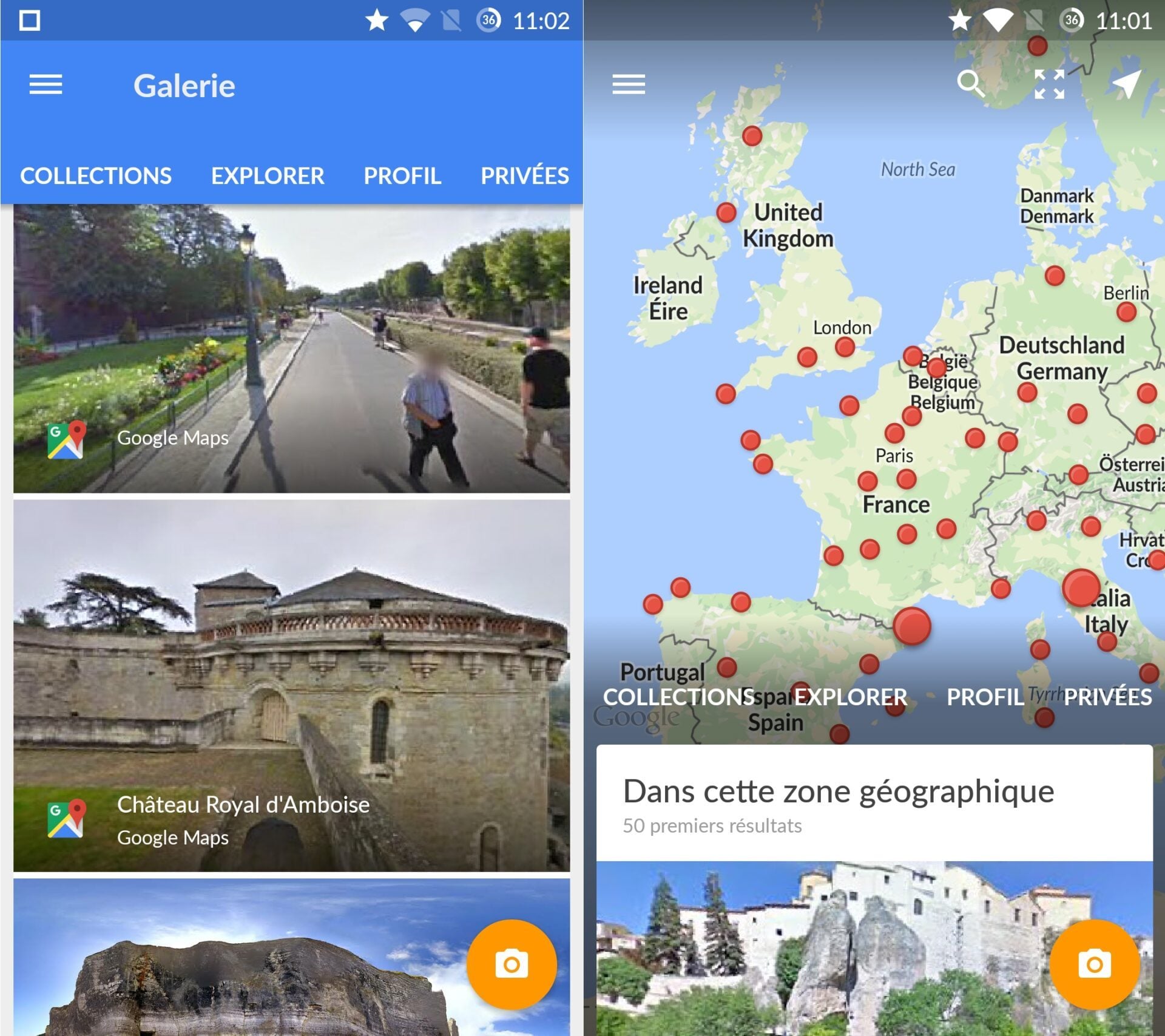 Auparavant intégré au sein de l’application Google Maps, Google Street View dispose maintenant de sa propre application. Le service de Google qui vous permet de vous balader virtuellement dans les rues du monde entier s’émancipe pour une bonne raison puisque l’application permet à présent de prendre des photos panoramiques et de les partager en ligne. Quatre onglets composent la galerie accessible dans Google Street View : Collections pour accéder à l’ensemble des images déjà présentes sur Street View, Explorer pour rechercher un lieu précis, Profil pour vous permettre de partager les clichés de vos endroits favoris, et enfin Privées pour les images que vous ne souhaitez pas rendre publiques.