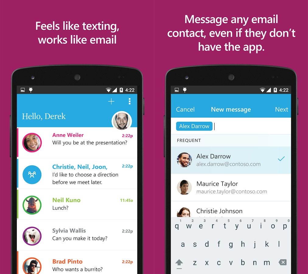 À Redmond, loin des provocations que se lancent à tour de rôle Apple et Google, Microsoft lève le voile sur Send, un projet de messagerie original issu de Microsoft Garage, et proposé au téléchargement sur… le Google Play Store et l’App Store. Si l’application n’est pour le moment disponible qu’auprès d’une poignée de pays dont les Etats-Unis, les possesseurs d’Android peuvent tout de même s’essayer à ce nouveau service en installant le fichier apk sur leur terminal. Hybride, Send se présente sur le fond comme un client mail, mais revêt les caractéristiques d’une messagerie instantanée traditionnelle, tant d’un point de vue design que technique. Désireuse de modifier votre rapport à votre boîte de réception et d’offrir à l’échange par mail tout l’attrait qui lui fait défaut, l’application imite les services de messagerie instantanée les plus connus et vous invite à lire vos emails comme vous liriez vos SMS. Dites adieu, donc, aux objets à rallonge, aux formules de politesse et autres signatures qui tendent à surcharger les messages que vous recevez, et profitez d’une sobriété bienvenue qui transforme vos échanges par mail en conversations naturelles et clarifiées. Bien entendu, si Send fait ses premiers pas sur des stores étrangers à Microsoft, il vous faut néanmoins posséder un compte Office 365 pour bénéficier des services de l’application.