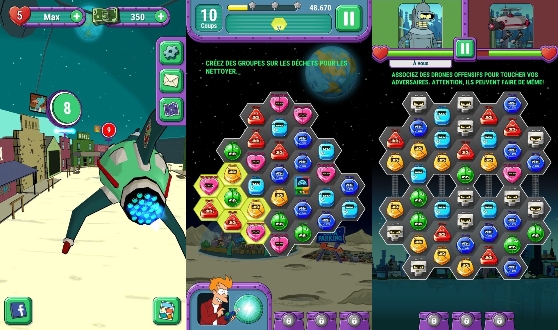 Après Les Simpson Springfield, le travail de Matt Groening fait de nouveau l’objet d’une adaptation vidéoludique mobile avec Futurama : Game of Drones. Jeu de puzzle et de réflexion, Futurama : Game of Drones annonce la couleur jusque dans le titre, misant sur un concept bourré d’humour. À l’instar de Candy Crush et consorts, le jeu implique que vous regroupiez des drones de livraison par couleur pour remplir vos objectifs intergalactiques. Pourtant, ne vous y trompez pas ! Il ne s’agit évidemment pas d’un match-3, mais d’un match-4. Truffé de missions variées, Futurama : Game of Drones vous embarque dans une aventure 3D dangereuse, mais presque pas létale, aux côtés de personnages emblématiques que sont Fry, Zoidberg, Bender ou Leela.