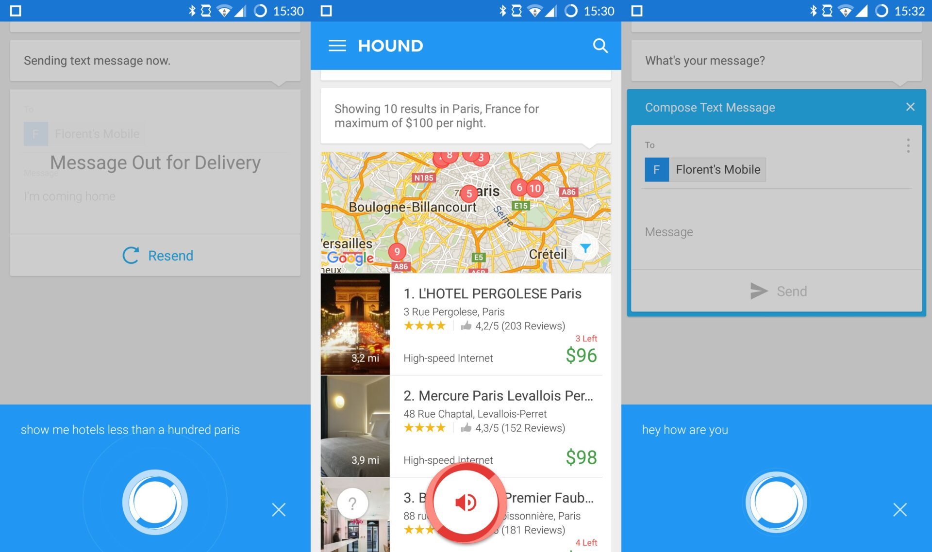 Réputé pour la qualité de ses travaux sur la reconnaissance vocale, la société SoundHound dévoile cette semaine Hound, un assistant personnel vocal analogue à Siri, Cortana ou Google Now. Plus rapide que ses homologues et parfaitement à même de comprendre le langage naturel sans recours aux traditionnels mots clés, l’application répond à l’interpellation « OK Hound » et s’attache à effectuer de nombreuses tâches que vous lui commandez. L’appli est ainsi capable d’envoyer des SMS, de passer des appels, d’effectuer une recherche web, d’accéder à votre agenda, de rechercher des photos et vidéos, de trouver un itinéraire GPS d’un point A à un point B, ou encore de lancer vos playlists musicales. Hound se révèle compatible avec Yelp et Uber, ce qui vous offre la possibilité de rechercher des hôtels ou de commander un chauffeur oralement, et d’obtenir des résultats précis, tenant compte de vos multiples critères. Pour le moment, Hound n’est disponible qu’en anglais. Cependant, son moteur de reconnaissance vocale est assez performant pour comprendre des requêtes formulées dans la langue de Shakespeare malgré un accent français prononcé.