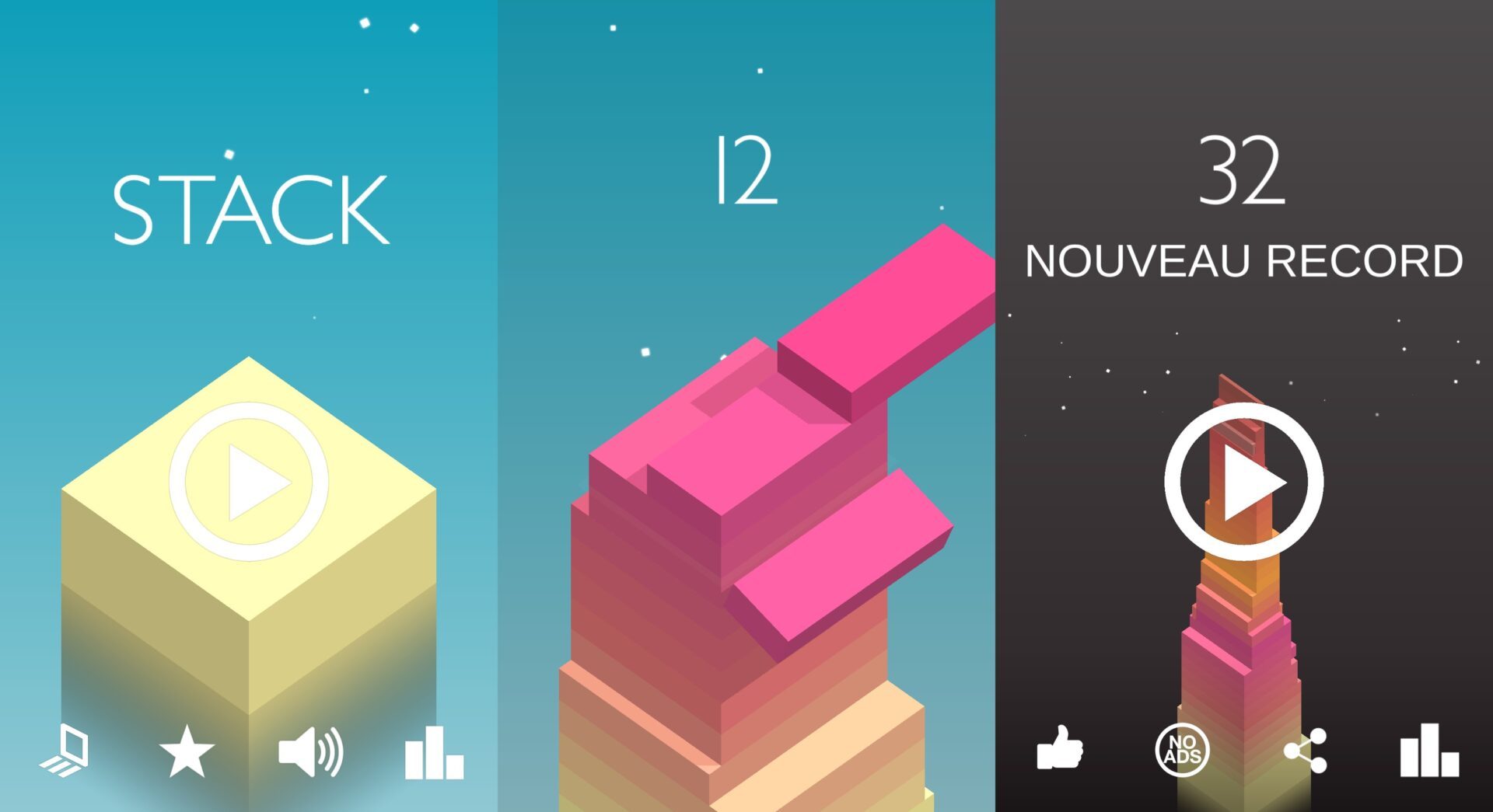 L’éditeur Ketchapp, reconnu pour ses jeux d’adresse et de rapidité sur mobile, présente son dernier né : Stack. Dans la même veine que ses prédécesseurs, Stack met à rude épreuve votre concentration et vos réflexes, vous enjoignant à atteindre le meilleur score possible. Pour ce faire, il vous faut empiler des dalles strictement identiques, en mouvement permanent. Mais prenez garde à les superposer correctement ! Car chaque bloc mal disposé se voit amputé du morceau qui dépasse de la tour érigée, réduisant d’autant la surface les dalles qui suivent. Par conséquent, plus vous progressez dans le jeu, plus votre tour s’affine, corsant un peu plus à chaque seconde une situation déjà critique.