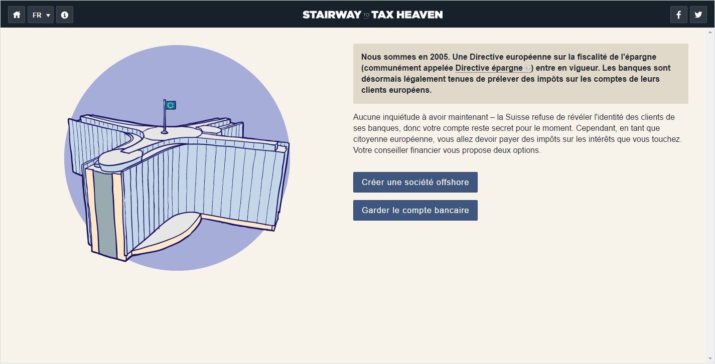 Le scandale a fait grand bruit en ce début de semaine, et il y a fort peu de chance pour que vous soyez passé à côté des Panama Papers. En revanche, si vous avez bien lu quantité de choses à leur sujet, les mécanismes de l’évasion fiscale vous ont peut-être échappé tant l’affaire est peu claire. Pour aider les honnêtes citoyens à bien saisir les enjeux du scandale et à assimiler les tenants et les aboutissants des Panama Papers, le Consortium international pour le journalisme d’investigation (ICIJ), a développé un jeu en ligne à visée pédagogique : Stairway to Tax Heaven. L’objectif est simple : mettre en place une stratégie pour défiscaliser une bonne partie de votre fortune, et la dissimuler sans vous faire attraper. Avant de commencer, vous choisissez d’incarner un footballer, une femme politique ou un chef d’entreprise. Bien évidemment, même si le jeu est inspiré de faits réels, les noms des acteurs ont été changés. Stairway to Tax Heaven vous pose ensuite une série de questions mises en situation auxquelles vous devez répondre, toujours dans l’optique de cacher votre argent. Pour chaque étape, un petit texte vous explique clairement quels individus et quelles professions entrent en scène dans le processus d’évasion fiscale ainsi que le rôle qu’ils tiennent, vous permettant de mieux assimiler les subtilités des Panama Papers.