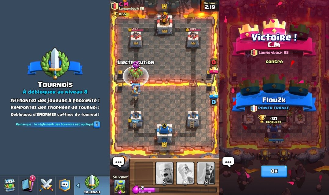 Racheté par Tencent le mois dernier, Supercell devrait, à l’image de Riot Games, profiter d’une des plus grandes communautés en ligne au monde et se développer encore plus vite. En attendant des résultats concrets, l’éditeur continue d’étoffer le contenu de ses titres et propose cette semaine une mise à jour importante de son dernier né Clash Royale. En passant en version 1.4.1, le jeu dévoile une nouvelle fonctionnalité majeure avec l’introduction de tournois. Pour en profiter, il vous faut atteindre le niveau 8. Lorsque vous jouez en mode tournois, vous affrontez des adversaires à proximité en vue d’obtenir des trophées et de débloquer de nouveaux succès. L’objectif ultime est évidemment de vous emparer de la première place du classement dans votre zone géographique, auquel cas d’énormes coffres viendraient récompenser tant de stratégie, d’ardeur et de maîtrise.