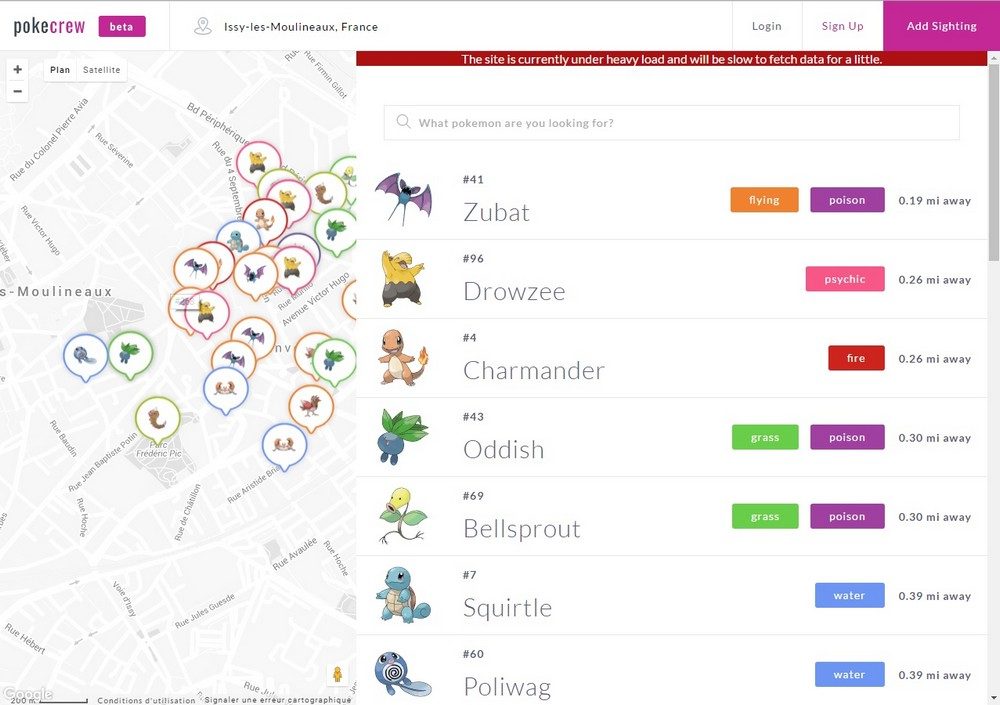 Une fois Pokémon GO installé sur votre appareil mobile, il ne vous reste plus qu’une chose à faire : sortir de chez vous et traquer les Pokémon dans la rue. Pour cela, vous pouvez suivre votre flaire infaillible de dresseur expérimenté, ou recourir à des outils externes indiquant l’emplacement de monstres de poche dans votre quartier. Il n’aura pas fallu attendre bien longtemps pour que la communauté des joueurs s’organise et présente PokeCrew, un service en ligne parfaitement adapté à la lecture mobile qui recense et répertorie les Pokémon par zones géographiques. Plutôt ergonomique, le site librement accessible est le fruit d’un travail participatif de chaque instant puisque ce sont les utilisateurs eux-mêmes qui signalent les emplacements des créatures lorsqu’ils les attrapent.