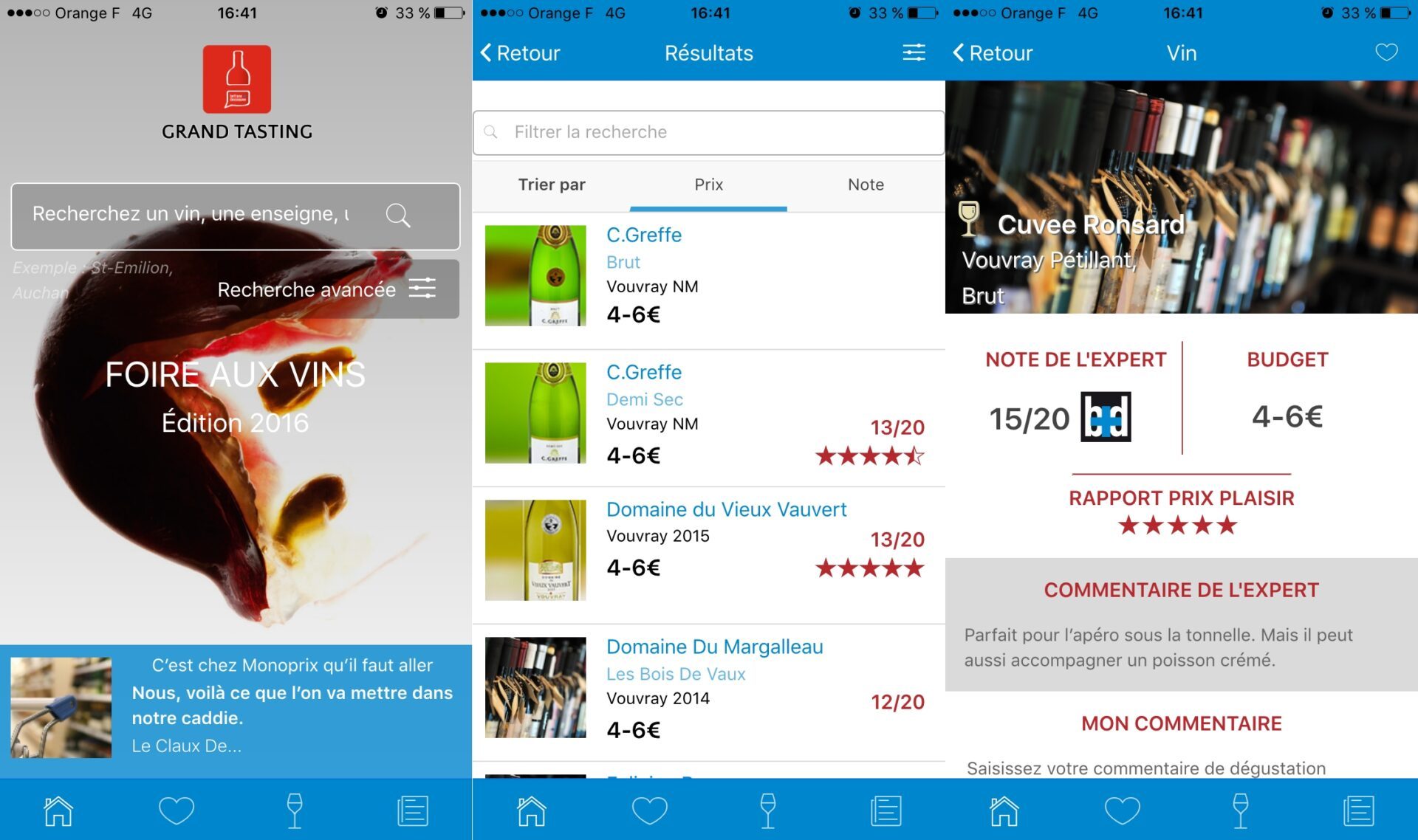 Grand Tasting recense des centaines de vins vendus dans les grandes surfaces et vous aide à faire votre choix. Chaque bouteille répertoriée a été goûtée, notée et commentée par des professionnels. Pour vous aider à faire le bon choix, l’application vous demande d’indiquer l’enseigne dans laquelle vous souhaiter acheter votre bouteille ainsi que votre budget, une couleur et un style pour vous proposer les meilleurs vins en fonction de vos envies.