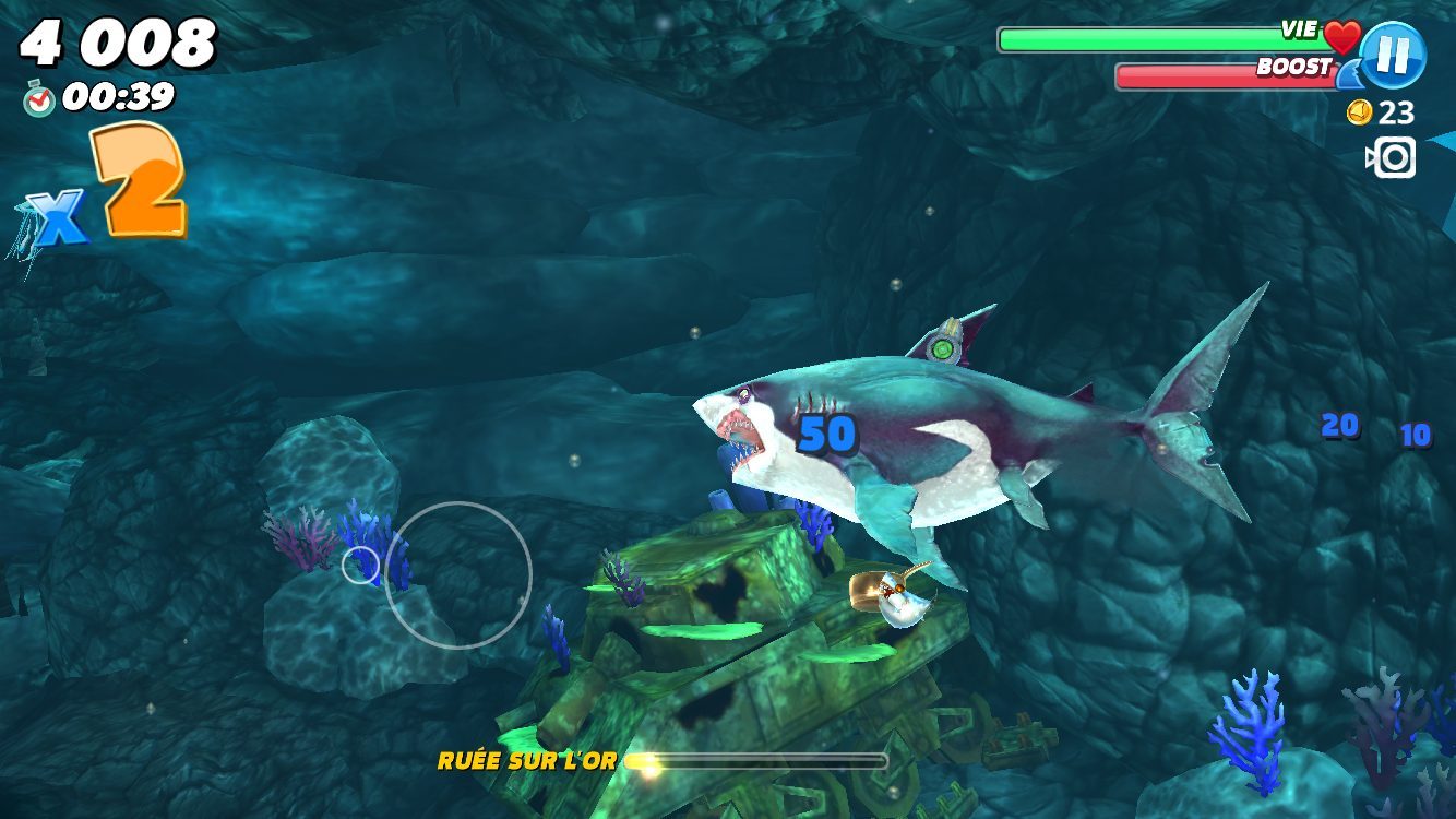 aEntrez dans la peau d’un squale affamé et partez explorer les fonds marins en quête de nourriture. Hungry Shark World vous propose de prendre le contrôle de gigantesques requins à différents endroits du globe. Le jeu vous fait évoluer dans un monde en 3D aux graphismes splendides et vous propose de partir à la recherche de quelques amuses-gueules à vous mettre sous la dent. Qu’il s’agisse de petits poissons, de méduses, d’autres requins, mais aussi de nageurs ou de plongeurs, tous les prétextes sont bon pour goûter de la chair fraîche. Croquez tout ce qui bouge et réalisez des combos d’enfer pour déclencher une ruée vers l’or.
