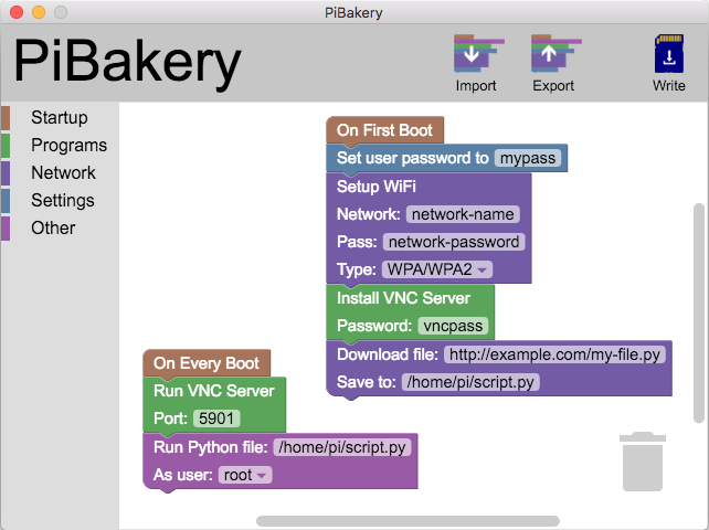 PiBakery est un utilitaire destiné à faciliter l’installation de Rapsbian sur un Raspberry Pi. Le programme se charge de créer une distribution personnalisée intégrant vos propres paramètres qu’il écrit ensuite sur la carte SD utilisée dans le nano ordinateur. PiBakery fonctionne à l’aide de scripts représentés sous la forme de blocs, ayant chacun une fonction précise. Il suffit alors de glisser-déposer chaque bloc l’un après l’autre, selon des options requises pour votre installation, puis de renseigner les paramètres correspondant à votre configuration pour chacun d’eux.