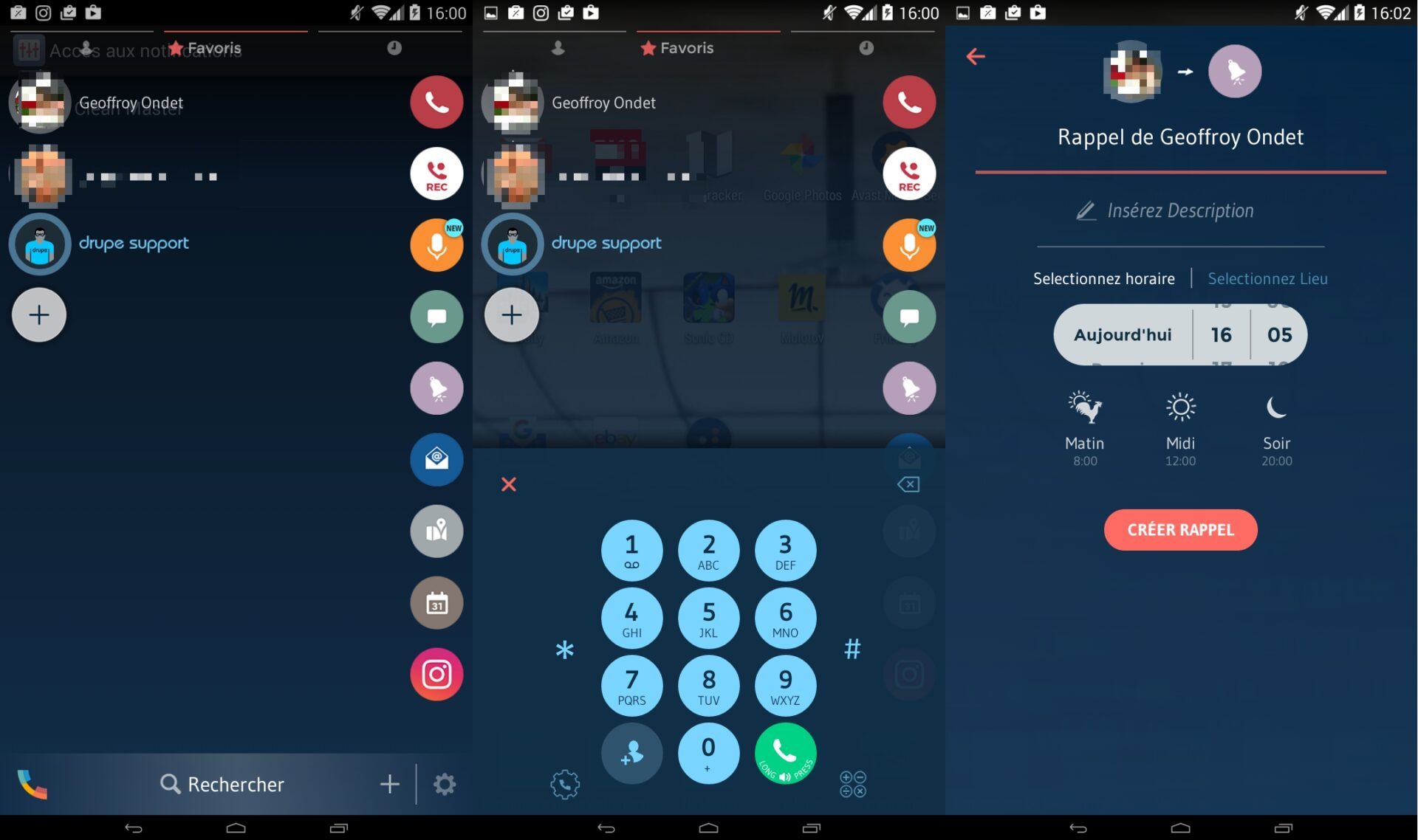 L’appli a plus d’un tour dans son sac puisqu’elle intègre dans le même temps, de nombreuses fonctionnalités nécessitant habituellement l’installation de modules tiers. Ainsi Drupe dispose d’un enregistreur pour sauvegarder tous vos appels entrant et sortant, d’un répertoire permettant d’organiser vos contacts Google, d’un mode talkie-walkie, ou encore d’un historique universel dans lequel sont regroupées toutes vos communications récentes.