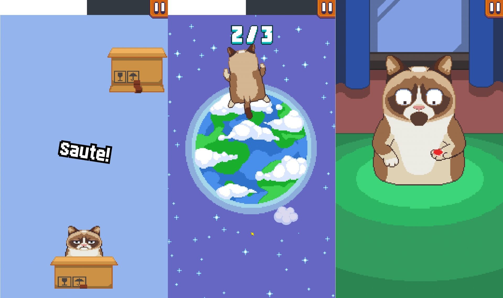 Grumpy Cat : un jeu affreux vous propulse dans l’univers d’un des plus célèbres mêmes d’Internet, revu à la sauce retro avec des graphismes pixélisés à souhait et une musique 8 bit particulièrement entêtante qui n’a de cesse de s’accélérer au fur et à mesure que vous avancez dans les niveaux.