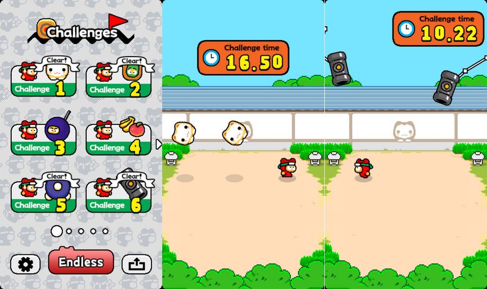 Comme son nom l’indique, Ninja Spinki Challenges !! se transforme en entraînement ninja, requérant sang-froid, patience, réflexes, rapidité et concentration maximale. Comme pour Flappy Bird, le système de contrôles est rudimentaire, vous aidant à focaliser votre attention sur le jeu en lui-même et non sur la manière de le prendre en main.