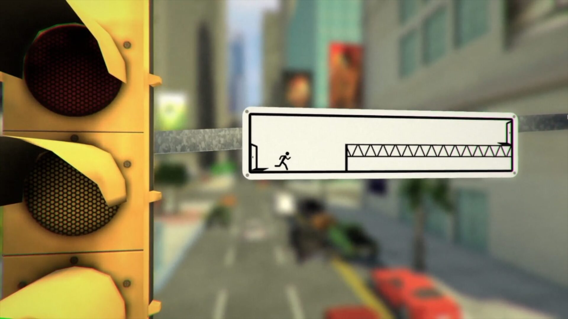 Heureusement pour The Pedestrian, le gameplay suit le pari esthétique. Votre personnage ne peut se déplacer qu’au sein d’un monde en deux dimensions, c’est-à-dire traverser uniquement des pancartes, panneaux, feux piéton qui font intrinsèquement partie du mobilier urbain. Le joueur est ainsi amené à explorer la ville d’une toute nouvelle façon aussi surprenante qu’amusante. Il ne s’agit toutefois là pas d’une promenade de santé puisque vous devez trouver le moyen de relier les plateformes entre elles pour permettre à votre stickman d’avancer.
