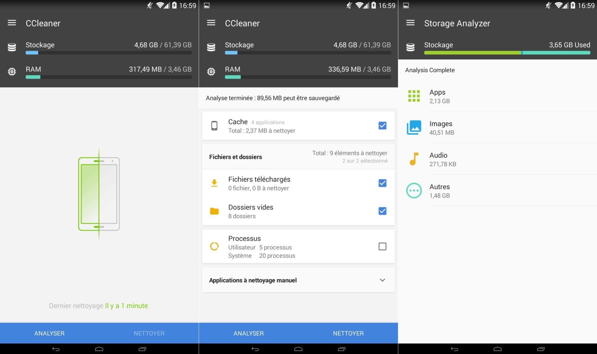 CCleaner se charge aussi de nettoyer le cache de vos applications, l’historique de vos navigateurs, ou encore de supprimer les fichiers présents dans le dossier de téléchargement, libérant ainsi de l’espace de stockage sur votre appareil.