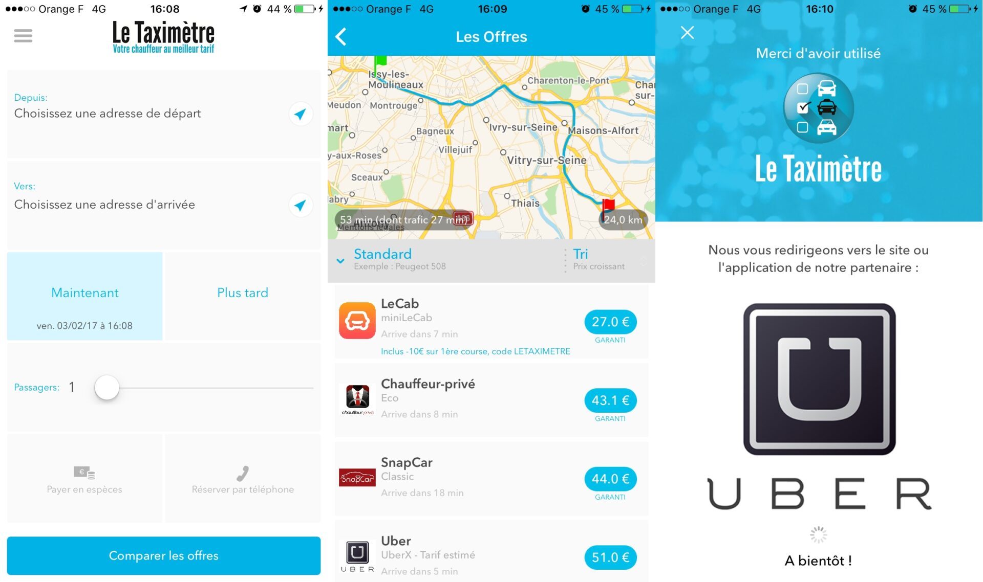 Taximètre affiche quasi instantanément la liste des services disponibles en vous indiquant par la même occasion le meilleur tarif. Lorsque votre choix est fait, vous n’avez qu’à le sélectionner dans Taximètre pour être redirigé automatiquement vers l’application ou le site du service.