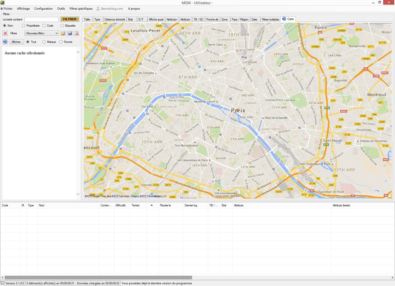 MyGeocacheManager filtre les caches géographiquement. Vous pouvez circonscrire vos balades à une zone spécifique. Par ailleurs, l’outil permet le téléchargement des images et indices pour une consultation hors ligne des fiches de géocaches.