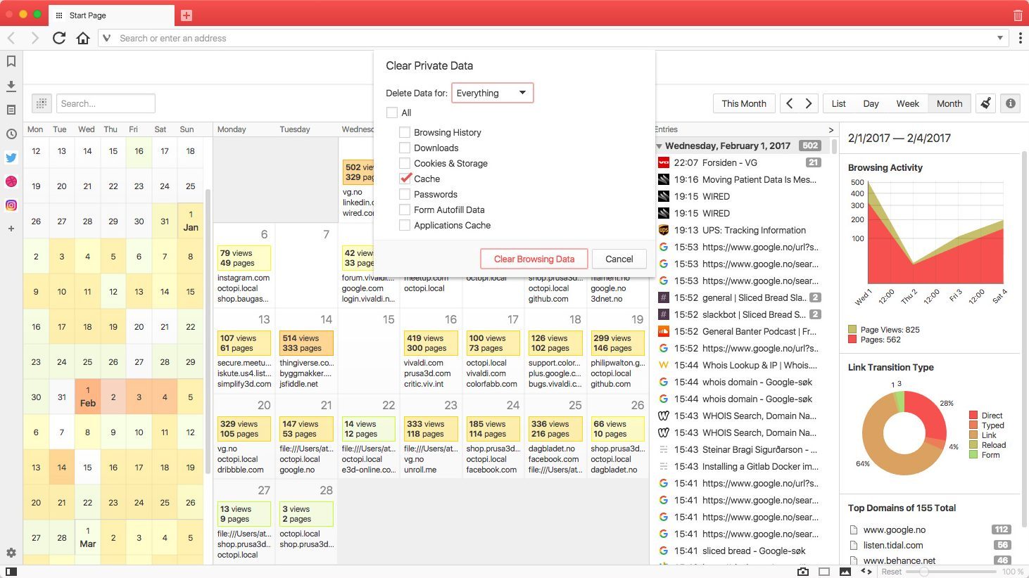 La page d’historique revoit donc entièrement sa structure pour proposer un affichage en quatre panneaux distincts. Un calendrier vous aide à accéder aux recherches effectuées à une date en particulier. À sa droite, une vue d’ensemble du mois en cours recense les activités en ligne comme le nombre de pages ouvertes et le nombre de vues. Pour ne pas perdre l’utilisateur, Vivaldi conserve un bloc dédié à l’historique quotidien, tel qu’il est habituellement listé. Le dernier encart dispense des informations graphiques quant à vos statistiques de navigation : rapport d’activité, types de liens ouverts, domaines les plus fréquemment consultés.