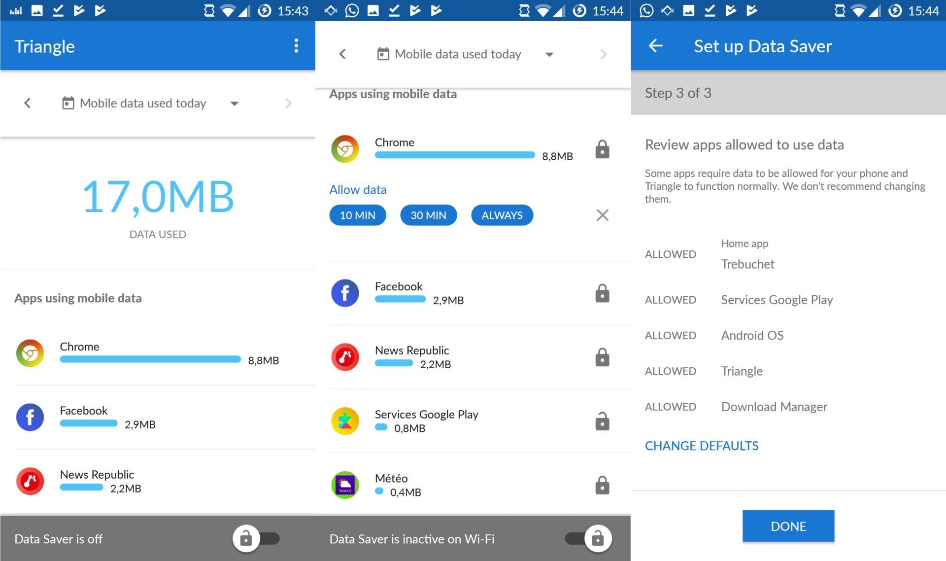 L’application de Google propose ainsi un contrôle poussé à l’échelle individuelle. Triangle permet de contrôler la durée d’autorisation de l’utilisation de la data pour chaque application indépendamment les unes des autres en choisissant une autorisation de 10 minutes, 30 minutes, ou constante. Aux Philippines, où l’application est testée, les utilisateurs économisant le plus de données mobiles sont récompensés par l’attribution d’une enveloppe de données mobiles additionnelle, une solution permettant aux utilisateurs de forfaits prépayés de surfer plus longtemps sans surcoût.