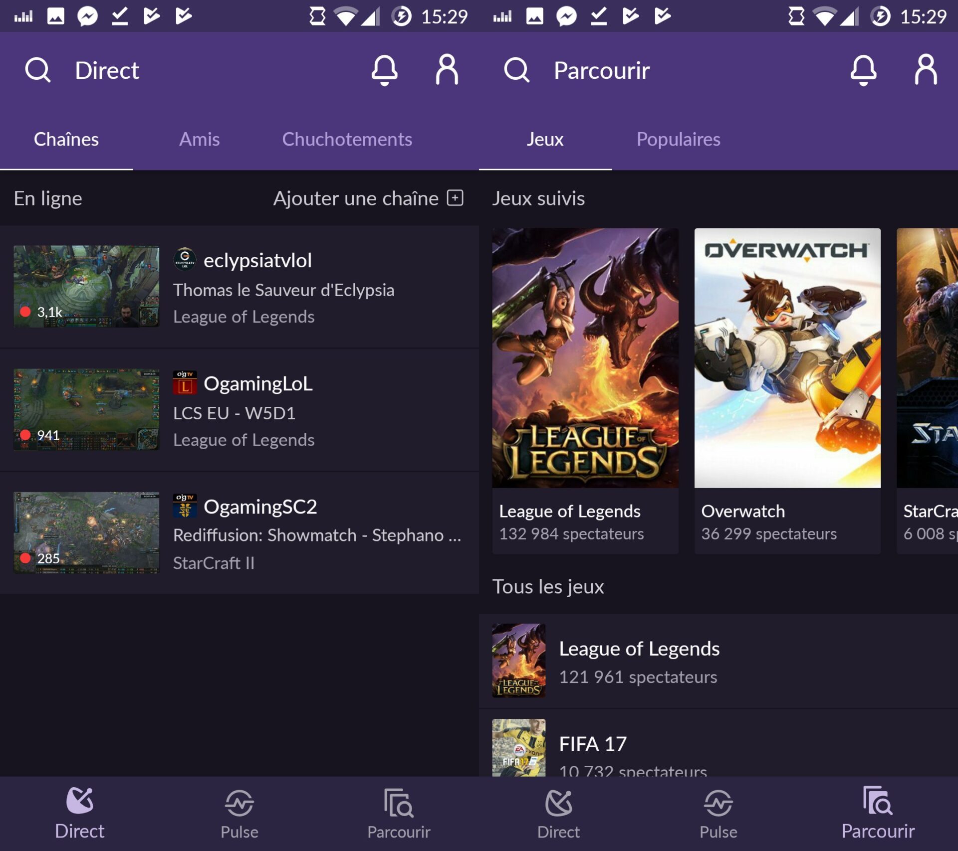 Outre cet ajout majeur, Twitch mobile bénéficie d’une refonte graphique totale et en profite pour gagner en clarté. Trois catégories essentielles composent la nouvelle barre de navigation et offrent un accès immédiat aux directs, à Pulse et au moteur de recherche. L’intégration du swipe rend l’utilisation de l’application beaucoup plus intuitive puisqu’il suffit de faire glisser son doigt vers la droite ou la gauche pour accéder à l’un de ces services. Interne aux catégories, le swipe simplifie également la navigation entre vidéos, listes de lecture et flux.