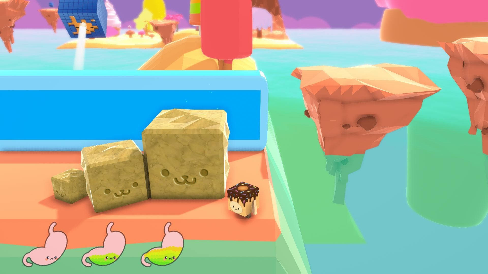 Dans Eat All The Things, vous incarnez un Bronut, contraction farfelue de brother (bro’) et donut, ce qui fait naturellement de vous un personnage gourmand déguisé en pâtisserie. Vous évoluez dans un univers de plateformes glacées en 3D meringuée, à la recherche de friandises, gâteaux et barres chocolatées susceptibles de vous rassasier.
