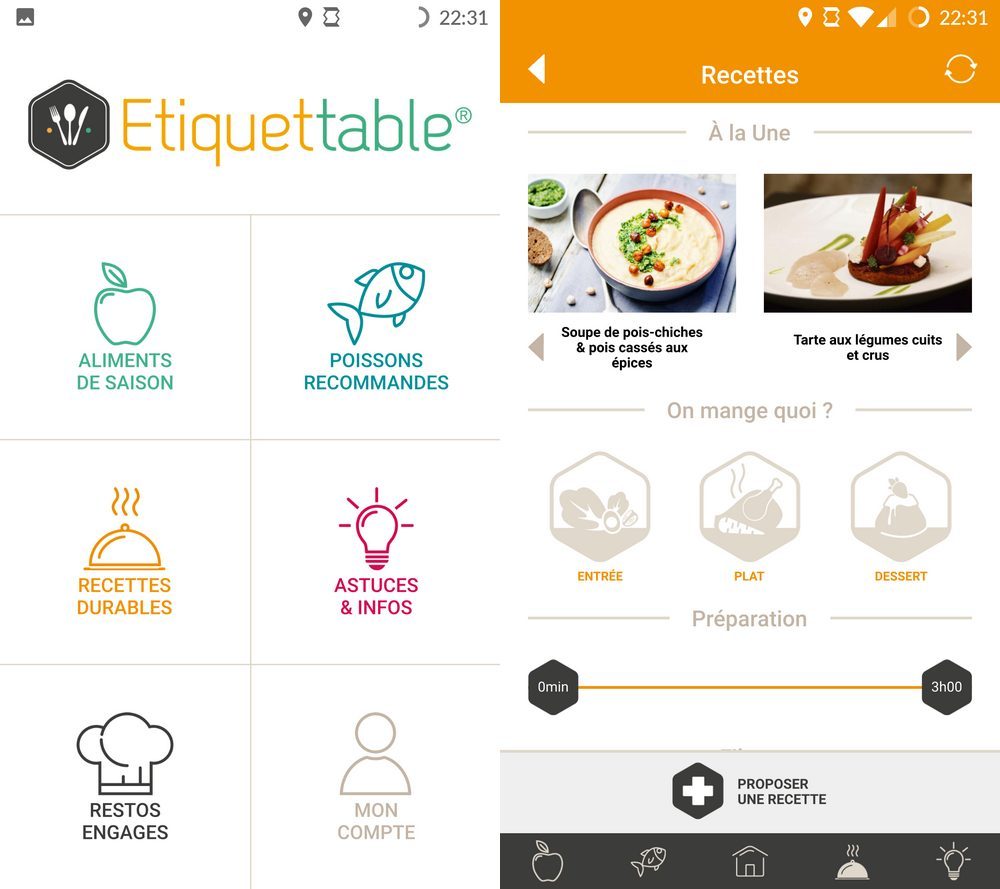 Etiquettable met en avant la gastronomie durable en proposant une application mobile collaborative en phase avec la cuisine éthique et saisonnière. On y trouve de nombreuses recettes à base de produits du moment, qu’il s’agisse de fruits, de légumes, de viande ou de poisson. Un calendrier des aliments de saison vous guide dans vos prochains achats de consommables tandis qu’un tableau répertorie les poissons que vous pouvez cuisiner en fonction de la période et de leur statut d’espèce menacée.