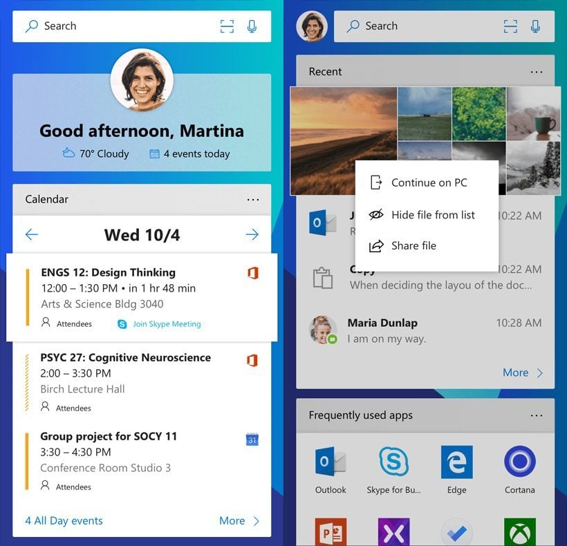 Microsoft Launcher s’efforce de s’adapter au profil de son utilisateur. Les options de personnalisation organisent votre fil d’informations et vous laissent la main sur les contacts, documents ou événements importants que vous souhaitez voir apparaître en page d’accueil.