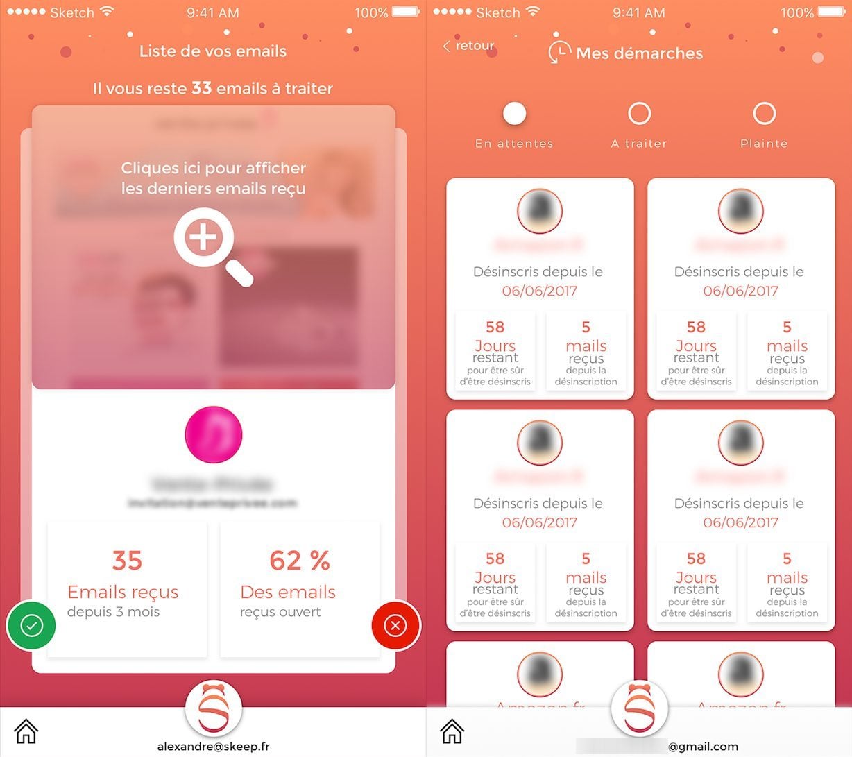 Skeep vous aide à reprendre le contrôle de vos données privées sur Internet grâce à une appli intuitive. Synchronisée avec votre adresse mail, elle analyse votre boîte de réception et détermine le taux d’ouverture de chaque newsletter rencontrée. En fonction de vos habitudes de lecture et du nombre de mails reçus, l’application se propose d’envoyer pour vous une demande de désabonnement aux sociétés émettrices.