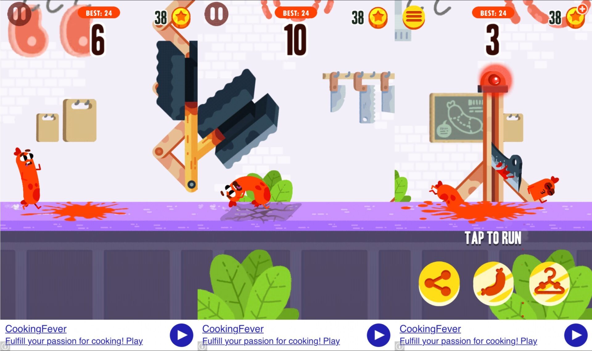 Échappez au hachoir, esquivez le grill et trompez la trancheuse dans une course infernale sur le plan de travail d’une cuisine en essayant de parcourir la plus longue distance possible. Run Sausage Run ! répond à un système de commande ultra simple consistant à exercer une pression sur l’écran pour courir et relâcher pour ralentir.