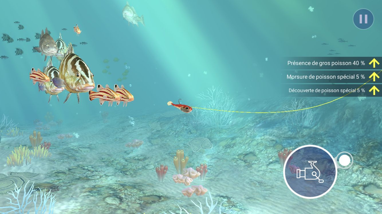 Dès que vous avez une touche, moulinez et ferrez votre poisson pour tenter de le sortir de l’eau : fatiguez-le, prenez garde à la tension de votre ligne pour ne pas perdre votre prise et sortez le poisson de l’eau pour l’ajouter à votre aquarium ou le vendre et ainsi accumuler de l’argent et des récompenses avec lesquels vous pourrez améliorer votre équipement. Chaque point de pêche propose des poissons différents. Remplissez les objectifs de capture et passez au point de pêche suivant à bord de votre bateau de plaisance.