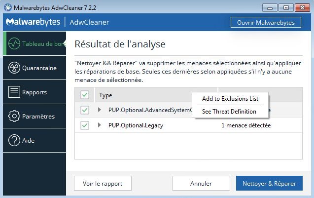AdwCleaner évolue discrètement et passe en version 7.2.2. L’outil de nettoyage change de look et offre la possibilité d’exclure un élément ou une famille d’items depuis le menu contextuel des résultats de l’analyse. À cela s’ajoute l’accès direct au centre de traitement des menaces par Malwarebytes, garant d’une gestion instantanément des programmes malveillants et modules douteux.