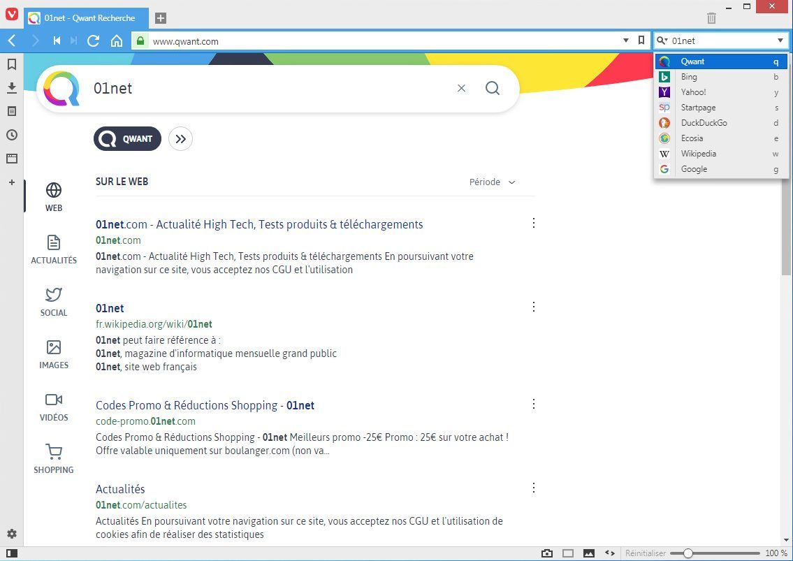 On accède à Qwant via le champ de requête de Vivaldi. En cliquant sur l’icône de la loupe, l’utilisateur déroule la liste des moteurs de recherche intégrés et sélectionne celui de son choix. La manipulation est également réalisable dans les paramètres de recherche du navigateur et permet de déterminer un moteur par défaut pour les requêtes lancées depuis la barre d’adresse.