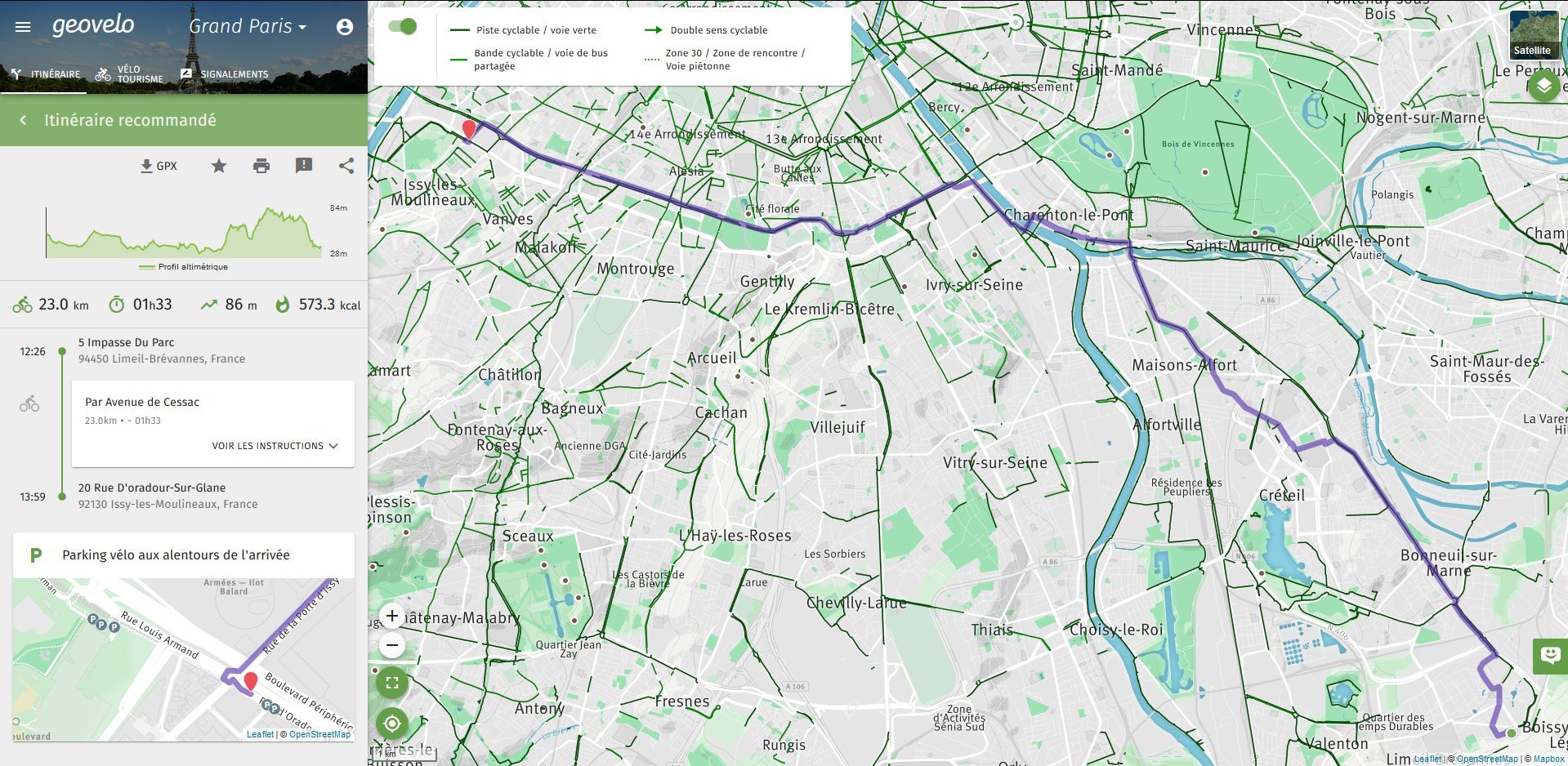 Chaque itinéraire généré par le service est accompagné d’un profil altimétrique pour vous donner un aperçu des côtes que vous devrez affronter, ainsi que de la distance totale, la durée de trajet évaluée, le nombre de calories brûlées ainsi que la quantité de CO2 non émis grâce à vos mollets.