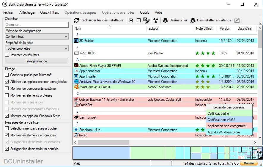 Bulk Crap Uninstaller ne se contente pas uniquement de désinstaller les logiciels que vous n’utilisez plus puisque tous les fichiers résiduels associés aux programmes désinstallés sont également supprimés. Pour simplifier votre travail de nettoyage, BCUninstaller vous propose de filtrer la liste des logiciels présents sur votre PC en cachant par exemple ceux développés par Microsoft, en affichant uniquement les mises à jour système, ou en affichant uniquement les applications de développeurs « non enregistrés ».