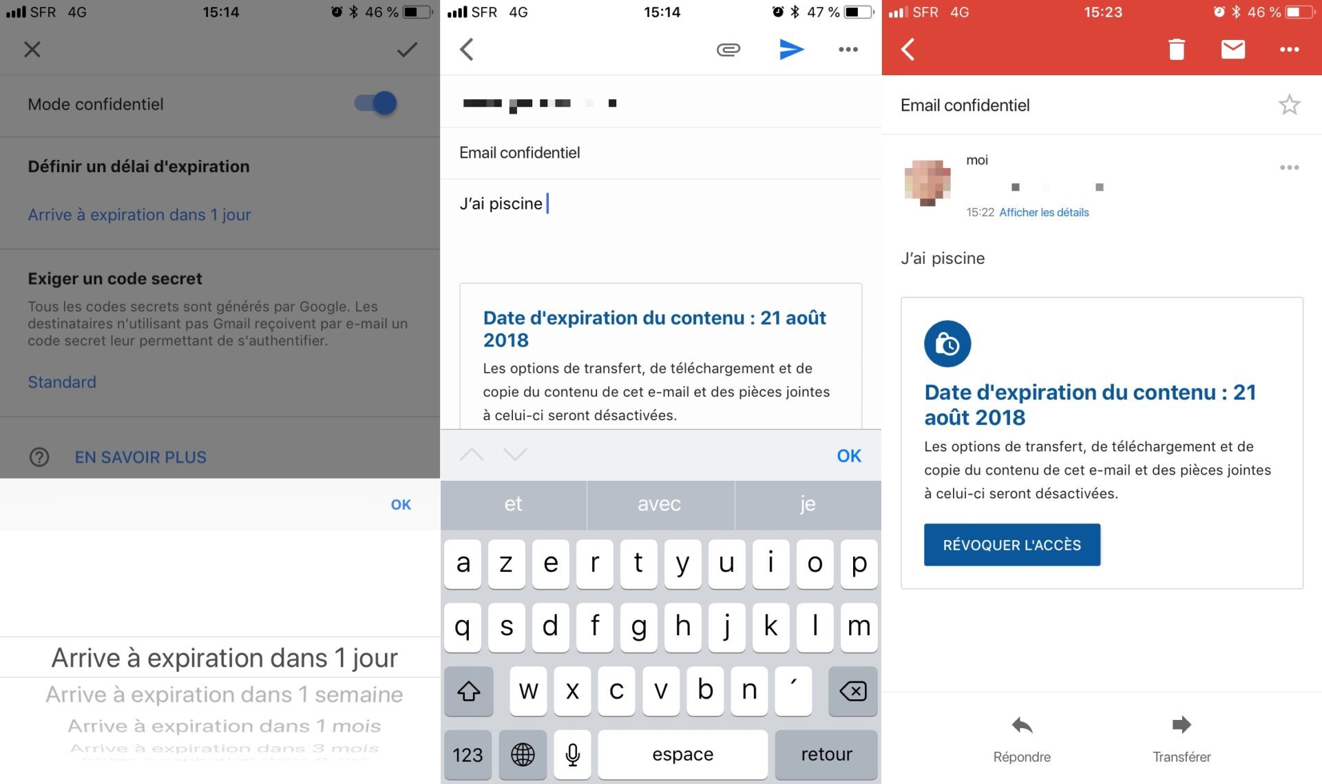 La première permet d’envoyer des messages en utilisant le mode confidentiel de la messagerie. Dévoilé il y a quelques mois avec l’activation de la nouvelle version de Gmail en ligne, le mode confidentiel permet d’envoyer un email auto-destructible passé une certaine date, avec la possibilité d’obliger la saisie d’un code secret pour l’ouvrir.