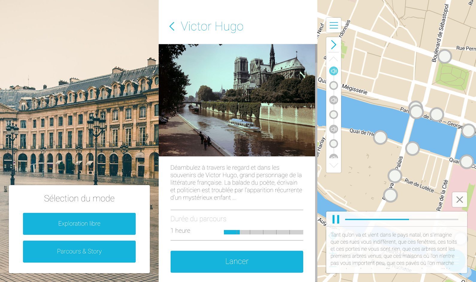 Pour s’adapter aux envies de chacun et offrir une expérience aussi dynamique que possible, Story Trip invite ses utilisateurs à choisir entre les deux modes de visites disponibles. En “exploration libre”, le promeneur repère sur une carte les points d’intérêt à proximité du quartier dans lequel il se trouve. En mode “parcours et story”, le visiteur accède à la liste des circuits alentours et optent pour une balade en particulier selon le temps dont ils disposent.