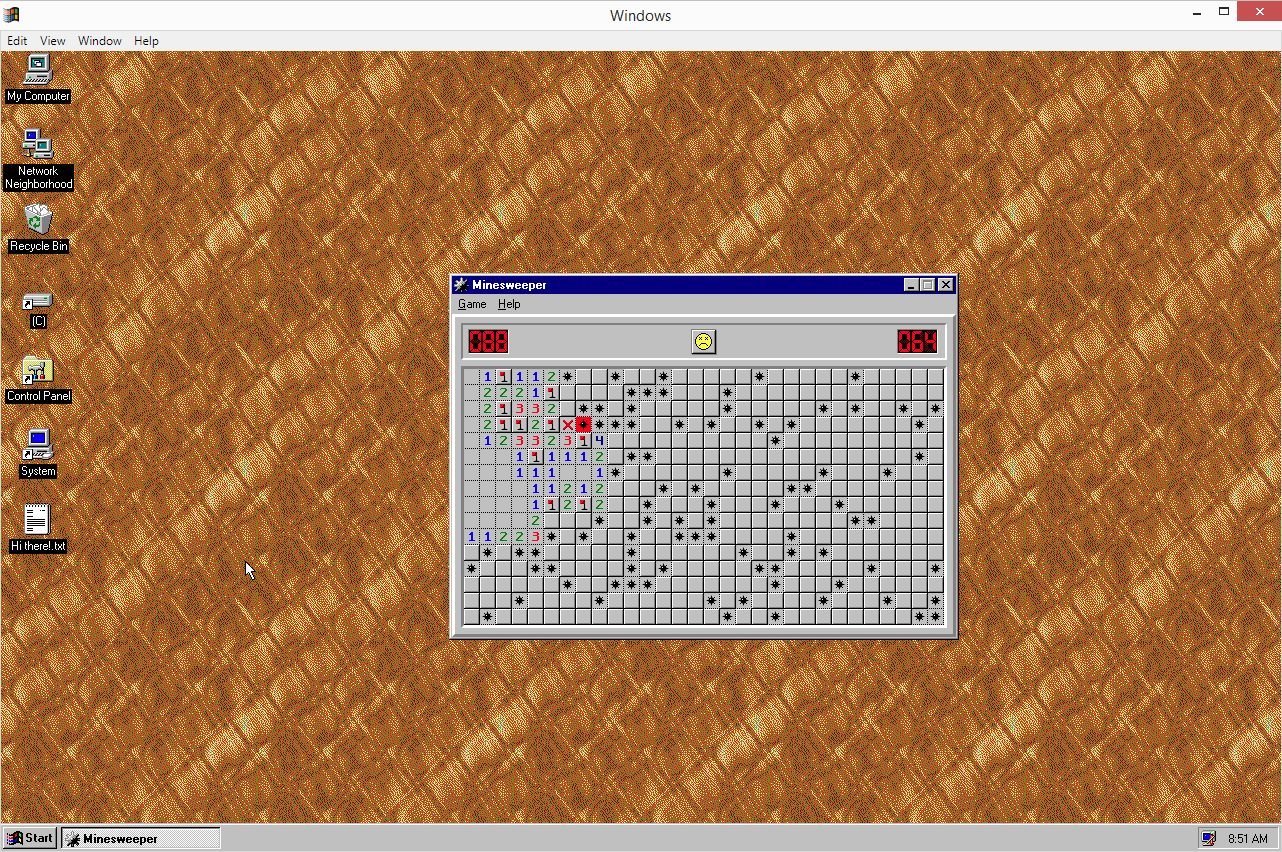 Windows 95 peut ainsi être exécuté sous la forme d’une application indépendante, aussi bien sur un PC Windows actuel, que sur un Mac ou sous Linux. Avec moins de 130 Mo sur la balance, Windows 95 s’exécute sans encombre sur les ordinateurs actuels et vous permet de jouer à des jeux DOS, de faire une partie de Solitaire ou de terminer une partie de Démineur en mode Expert. Cerise sur le gâteau, la dernière version en date ajoute le support des disquettes.