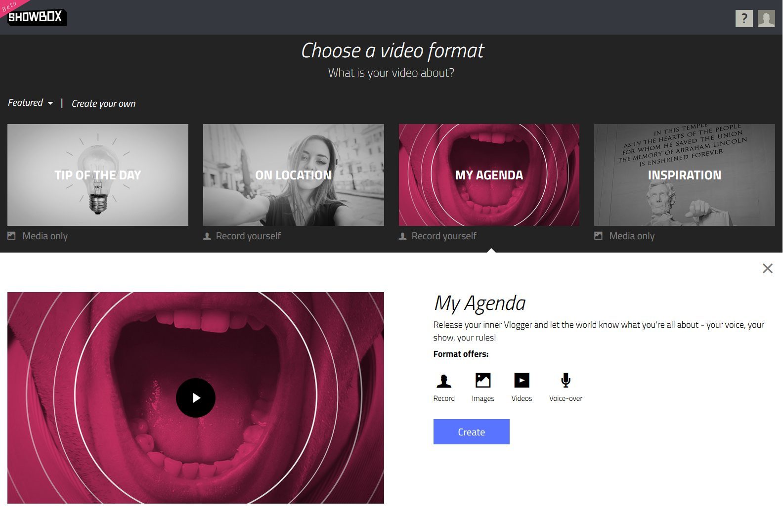 Showbox est un service en ligne permettant de réaliser des montages vidéo directement depuis votre navigateur, sans avoir de compétence technique particulière. Le site s’appuie pour cela sur un catalogue de thèmes prêts à l’emploi que vous devrez remplir avec des éléments précis, simplifiant ainsi grandement le travail de l’utilisateur. Il suffit ensuite d’intégrer les éléments nécessaires pour « habiller » la vidéo avec votre contenu et générer la production finale. Le site vous guide du début à la fin, et vous promet une vidéo au rendu quasi professionnel en quelques dizaines de minutes.