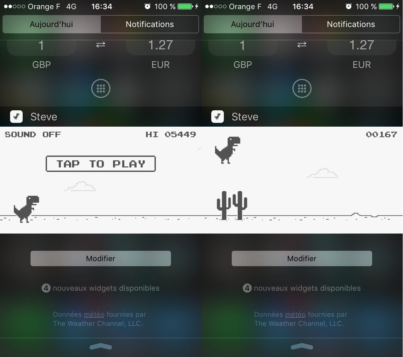Vous ne vous servez jamais des widgets du panneau « Aujourd’hui » présent dans le centre de notifications d’iOS ? Steve devrait sans doute lui redonner un peu d’intérêt. Ce jeu gratuit a la particularité de s’installer tout droit dans le centre de notifications de votre iPhone ou de votre iPad. Le jeu met en scène Steve, un dinosaure parti dans une interminable course, que vous devez contrôler en le faisant sauter au dessus des cactus qui se dressent sur sa route, pour parcourir la plus longue distance possible.