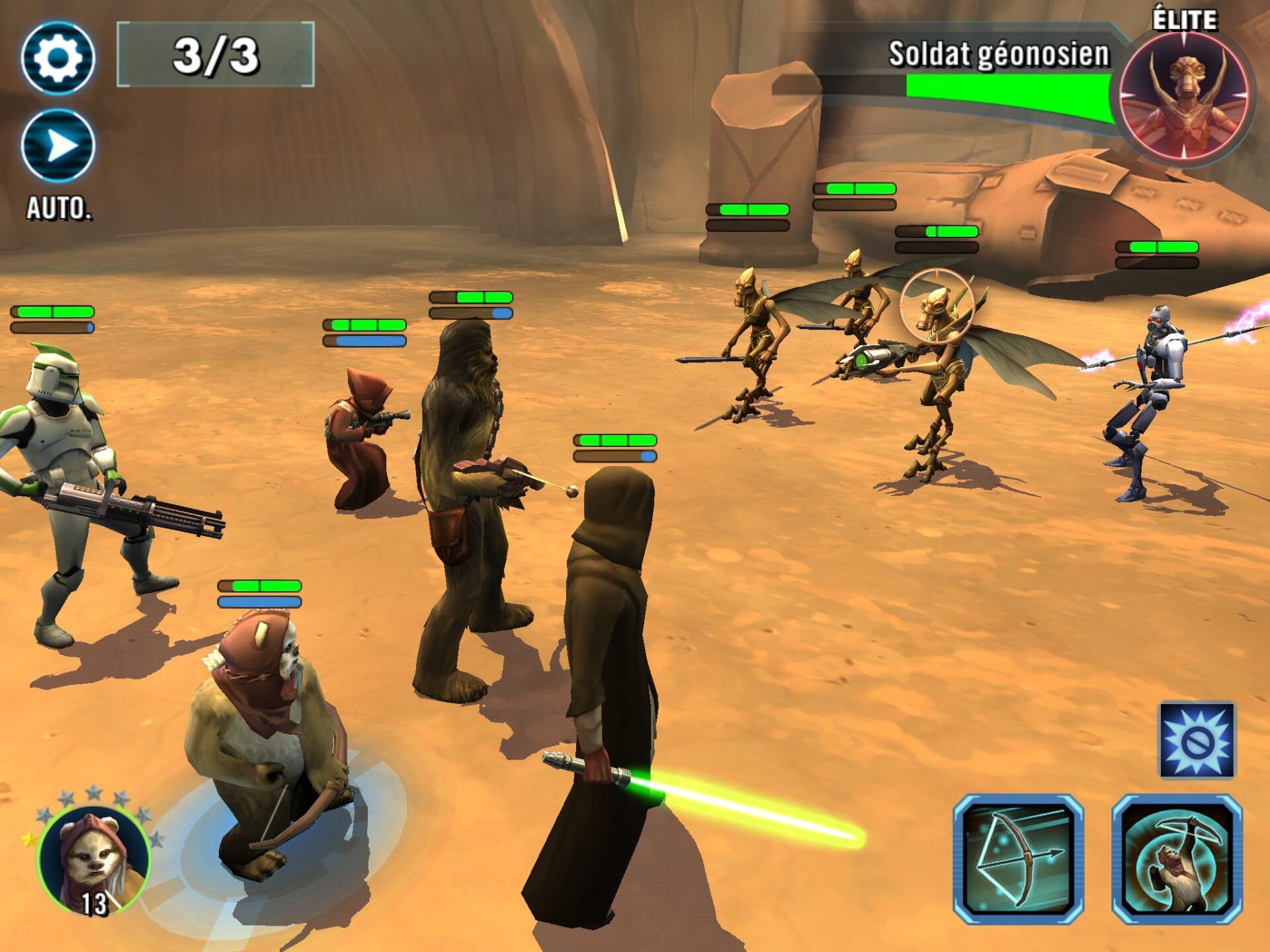 Traversant les âges depuis La Menace Fantôme jusqu’au Réveil de la Force, Star Wars : Galaxy of Heroes propose de collectionner non pas des cartes, mais des personnages emblématiques de la saga historique. Classé dans la catégorie RPG, Star Wars : Galaxy of Heroes vous propose de prendre part à plusieurs missions à difficulté croissante. Pour triompher, vous devez combattre au tour par tour des adversaires coriaces en trois manches par affrontement. Chaque victoire vous octroie des points d’expérience, de force et de mana qui vous permettent de progresser et monter en niveau. Notez bien que chaque personnage possède ses propres compétences dont il faut user stratégiquement pour défaire vos adversaires. Mis à jour cette semaine sur Android et iOS, Star Wars : Galaxy of Heroes introduit un système de guilde que les joueurs apprécieront. Il est désormais possible de créer sa propre guilde, d’en rejoindre une existante, d’obtenir des récompenses individuelles et collectives, de discuter stratégie avec d’autres membres de la guilde, ou encore de participer à des raids organisés lors des phases de combat dynamiques.