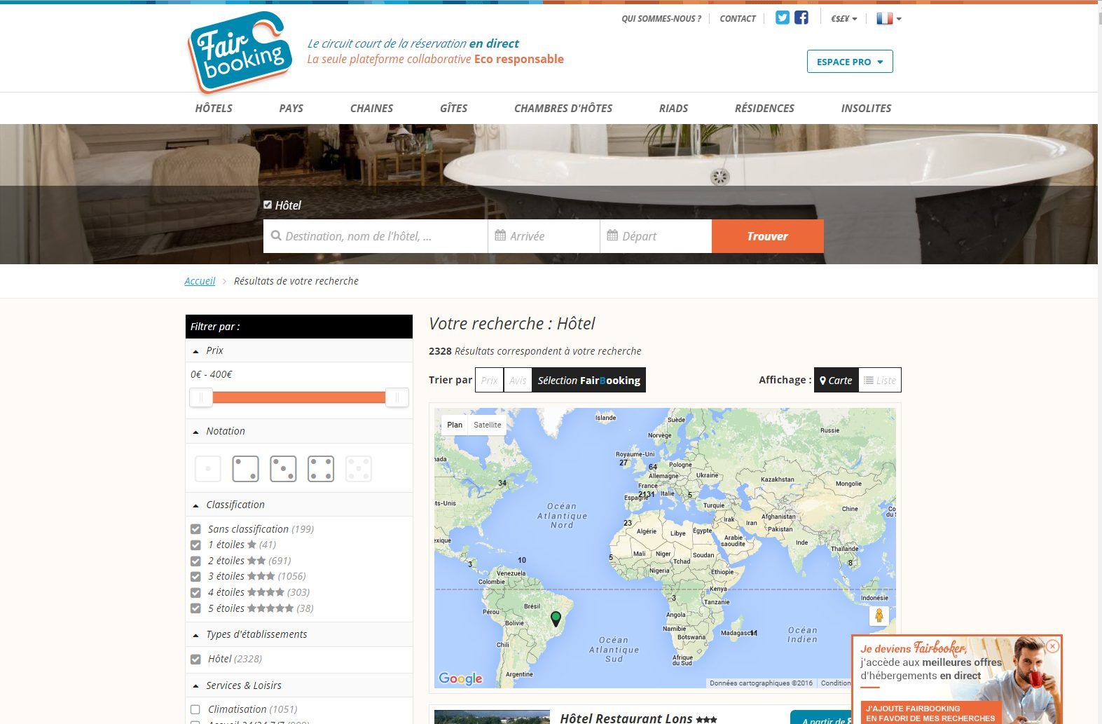 Comme près d’un tiers des Français cette année, vous n’avez peut-être toujours pas booké vos vacances d’été malgré la proximité de l’échéance. Les solutions de facilité vous guideront sûrement vers des plateformes de réservation en ligne mettant en avant des destinations à prix imbattables, même au dernier moment. C’est dans cette mouvance actuelle qu’est née FairBooking. À l’instar de Booking, Kayak ou LastMinute, FairBooking est une centrale de réservation en ligne mettant en contact vacanciers et professionnels de l’hôtellerie. Toutefois, l’initiative écoresponsable se démarque de ses concurrentes par son désir d’équité. En effet, là où les plateformes de renom prélèvent en moyenne 16% de commission chez les professionnels, FairBooking garantit la mise en relation gratuite et totalement transparente des clients et professionnels. De la sorte, chacun y trouve son compte, les hébergeurs profitant d’une rémunération non tronquée, les estivants bénéficiant d’un bon plan responsable (réduction, petit-déjeuner offert, surclassement, etc.). Le modèle économique de FairBooking repose sur un système de cotisation des professionnels de l’hôtellerie qui versent annuellement entre 150 et 400€ à la plateforme, en fonction de la taille de l’établissement.