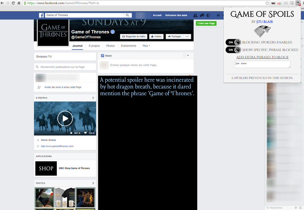 Conscient de l’ampleur du phénomène, un développeur empathique à codé une extension libre pour Chrome capable de masquer toutes les références explicites ou implicites à la série. Intitulé GameofSpoils, ce plugin se niche discrètement près du champ URL de votre navigateur. En cliquant sur l’icône de GameofSpoils, deux possibilités s’offrent à vous : bloquer tous les types de spoilers et/ou bloquer des termes et expressions spécifiques. La solution se révèle efficace, exigeant confirmation de votre part dès lors que vous tentez d’accéder à du texte ou des photos susceptibles de contenir des informations sensibles au sujet de Game of Thrones. Et pour parfaire son mode de fonctionnement, GameofSpoils dévoile les éléments que vous avez décidé de déverrouiller en douceur pour vous permettre de revenir sur votre décision jusqu’au tout dernier moment.