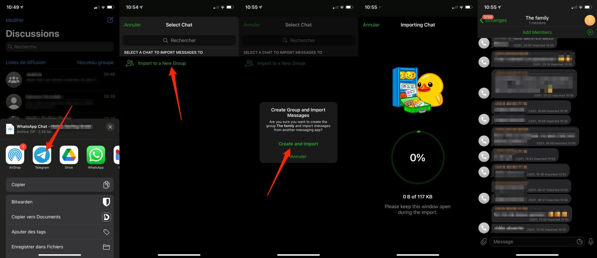 Telegram demandera ensuite de choisir une discussion ou un groupe vers lequel importer les messages exportés. Une fois le processus d’importation terminé, tous les messages et contenus multimédias prennent place dans la conversation et sont estampillés comme ayant été importés.