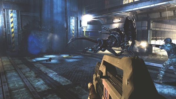 Quatrième choc. On savait que l’architecture militaro-alien n’était pas beaucoup plus réputée que l’architecture pavillonnaire, on en a la confirmation. Le level design a visiblement oublié de monter dans la navette. Tout ici est exigu, désespérant, vide, rigide, peu inspiré et d’un classicisme qui ferait passer Daïkatana pour un rêve éveillé. Il y a bien quelques fulgurances, qui rappellent un peu ces morceaux plein de promesses qu’on retrouvait dispersés de-ci delà dans Duke Nukem Forever. Mais qui dit fulgurance dit fugacité. Alors au lieu d’avoir peur et de trembler l’arme au poing, en se demandant si on ne ferait pas mieux de se rouler en boule dans ce coin sombre, on avance en dézinguant de l’alien ou du soldat de la Weyland-Yutani en sursautant de temps à autres, juste le minimum syndical, et toujours accompagné.