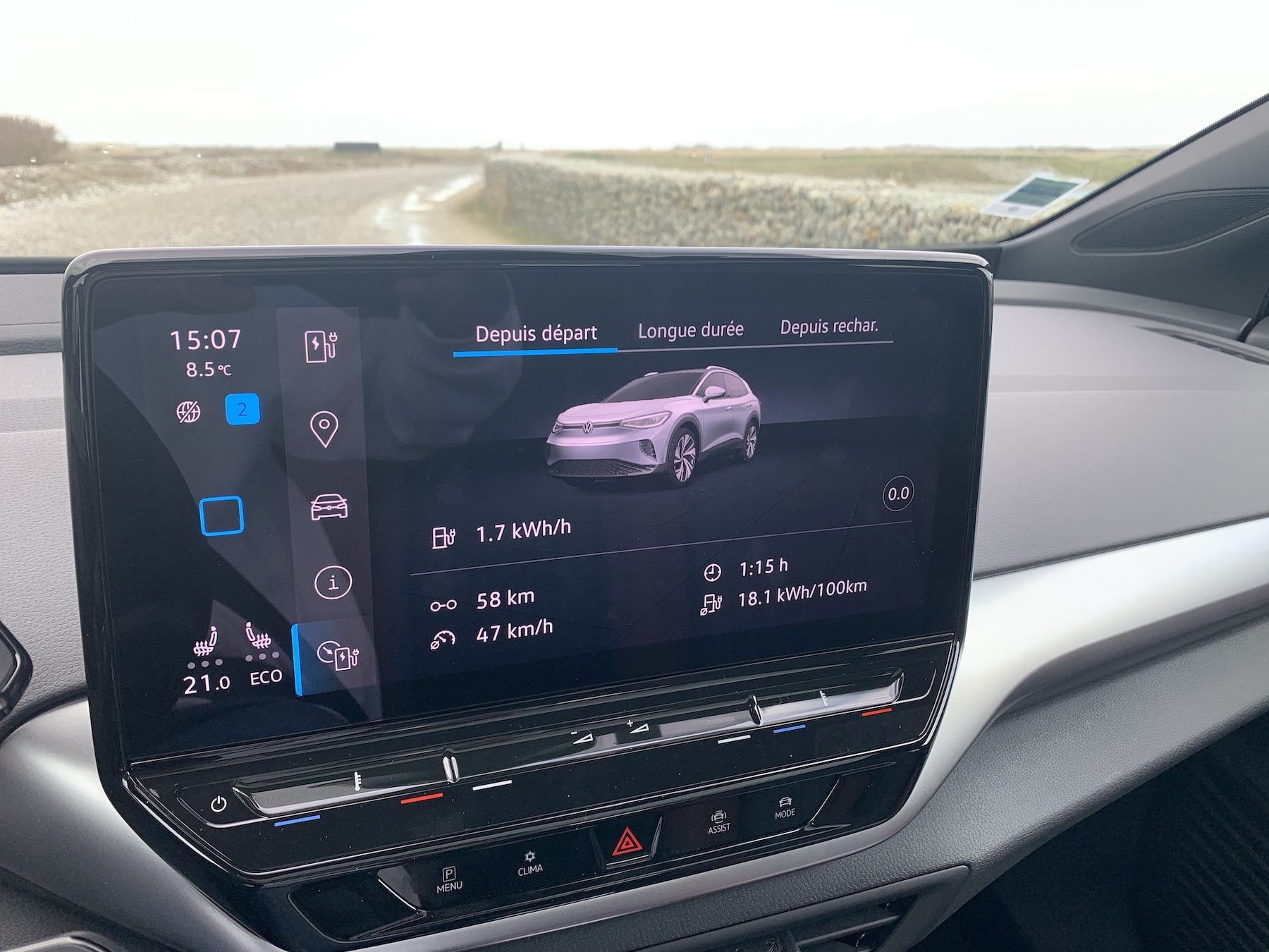 En effet, sur notre trajet mêlant autoroute, parcours urbain, mais surtout réseau secondaire, nous sommes parvenus à une consommation de 18,1 kWh en adoptant une conduite très coulée.