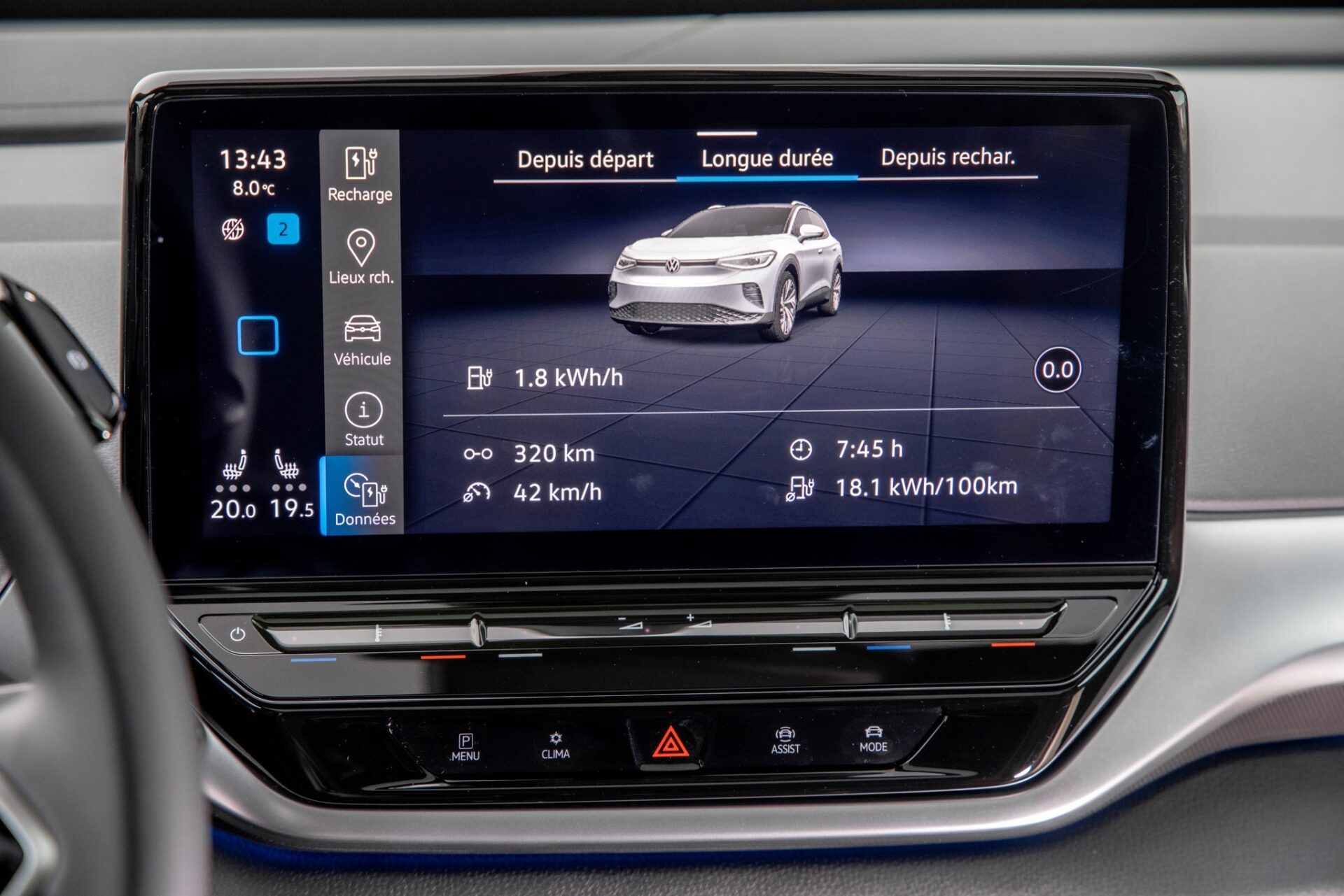 En revanche, sur autoroute régulateur bloqué à 130 km/h, la consommation frôle les 25 kWh/100 km. Sur ce point, l’ID.4 affiche les mêmes faiblesses que la concurrence. Les trajets longs sont envisageables mais à condition de s’arrêter pour recharger tous les 300 km environ.