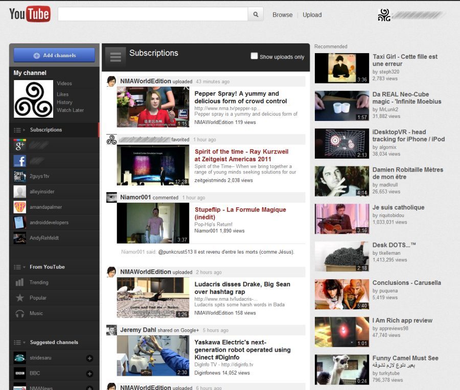 Au centre, les nouvelles vidéos en provenance de vos contacts abonnements YouTube sont affichées. A droite, enfin, sont placées les vidéos « recommandées » par le service en fonction de vos précédentes lectures. A noter que seule la page d’accueil de YouTube évolue véritablement pour l’instant : les autres pages du site restent quasiment identiques.