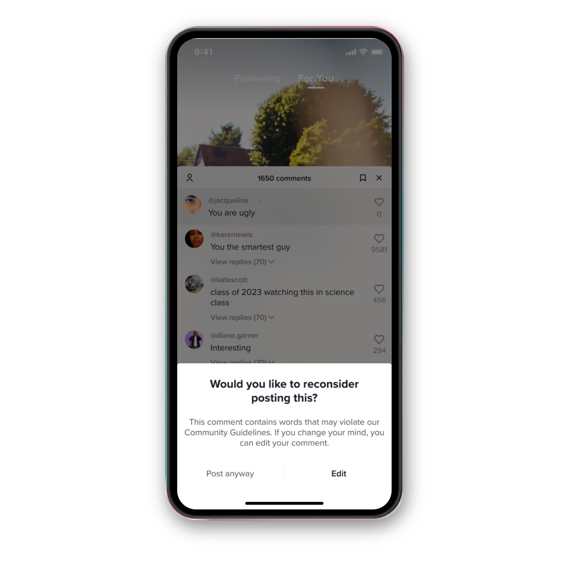 Pour renforcer son artillerie contre le harcèlement, TikTok affichera un pop-up d’alerte pour demander aux utilisateurs sur le point de publier un commentaire qui semble inapproprié, de réfléchir à ce qu’ils souhaitent dire, et d’éditer leur commentaire en conséquence.