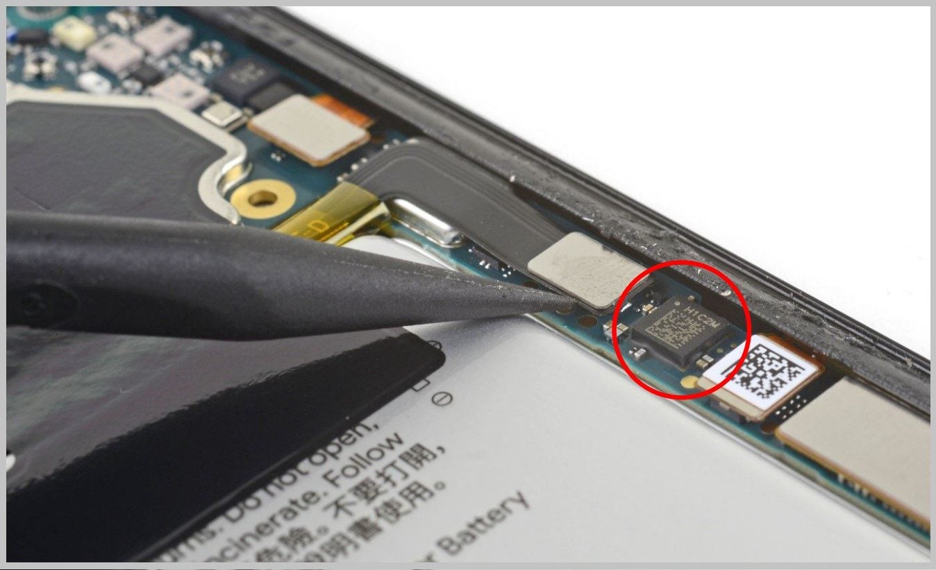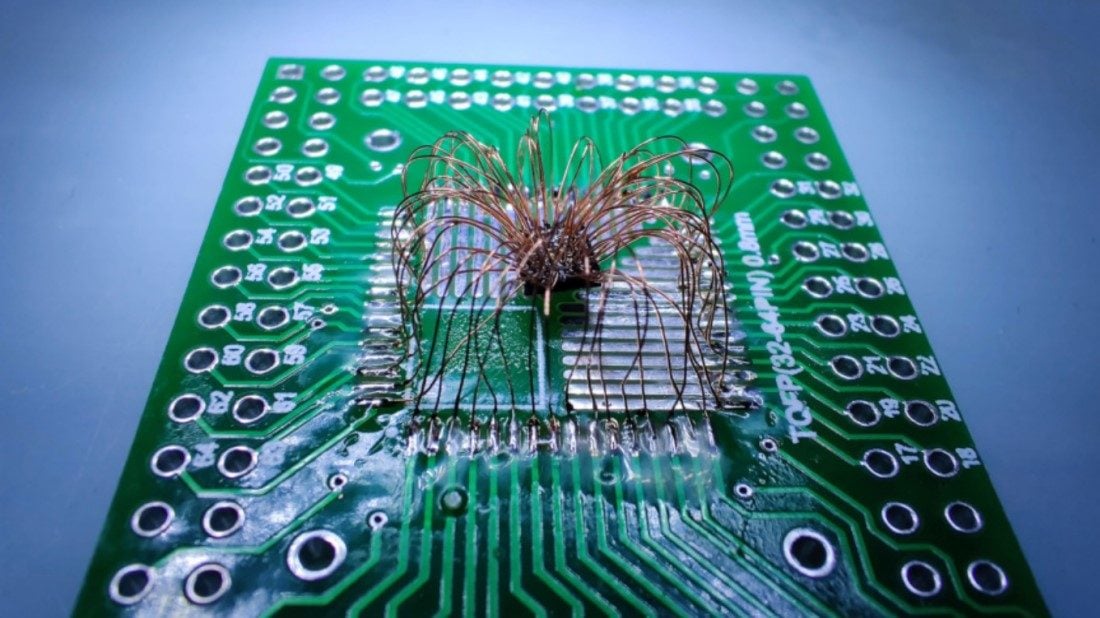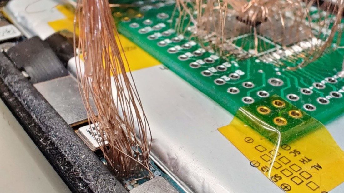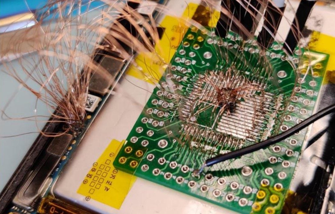 Pour y arriver, les chercheurs ont créé un dispositif incroyablement complexe. Après avoir détaché la puce de son socle PCB et supprimé la couche de protection en polyépoxyde, ils ont mis au jour 64 points de connexion. Ces points ont été rebranchés sur une carte d’adaptation qui, elle-même, a été reconnectée point par point au socle PCB du smartphone.