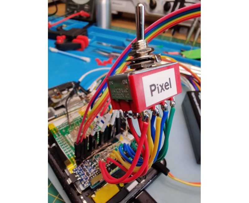 Grâce à cette carte d’adaptation, il était possible d’intercepter les échanges sur le bus SPI, mais il n’était pas possible d’envoyer des commandes. Pour cela, les chercheurs ont dû aller encore un cran plus loin et connecter en parallèle un second contrôleur SPI piloté… par un Raspberry Pi. Un gros bouton permettait ensuite de switcher, en fonction des besoins de l’analyse, entre le contrôleur SPI du Pixel et celui du Raspberry Pi.